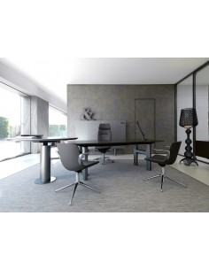 TAU se caractérise par ses lignes arrondies qui créent une harmonie sinueuse dans l'environnement de travail. Plateaux/piètements en finition: - plaqué Chêne teinté foncé ou Noyer Italien- laqué blanc poli ou gris asphalte poli La gamme s'accompagne également de rangements, tables de réunion et panneaux modulaires en bois.