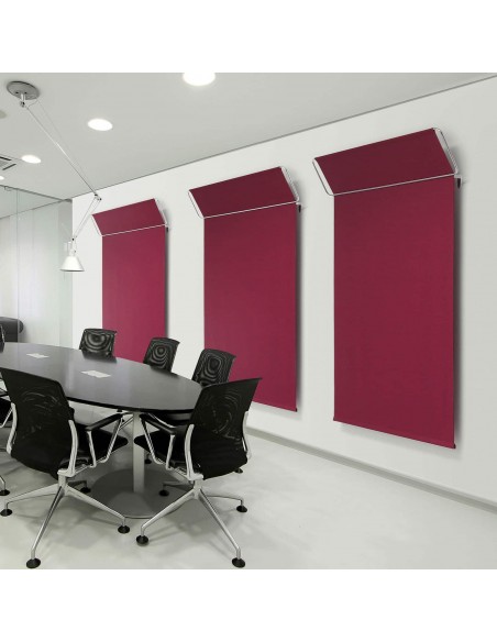 Tissu insonorisant «Snowsound Fiber 3 Melange» entièrement en polyester, avec rainurage des bords supérieur et inférieur pour permettre le passage du cadre de fixation murale et de la barre de renforcement / contrepoids respectivement.