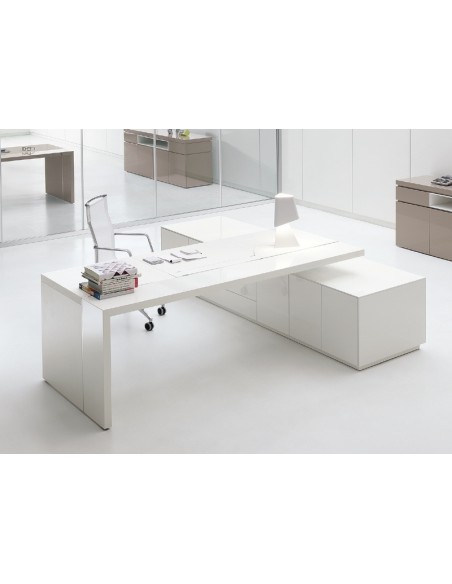 Les plateaux de travail peuvent être tout en bois, en bois et cuir écologique ou en laqué mat avec partie centrale recouverte de cuir écologique.